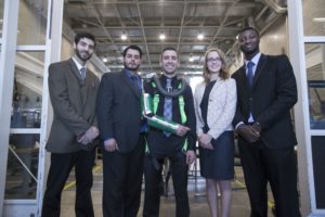 In a surprise upset at the College of Engineering and Engineering Technology’s fall Senior Design Day, the structural harness for enhanced load lifting – or SHELL – project was awarded the Engineering andTechnology Alumni Society Engineering Excellence Award, despite coming in second in the mechanical engineering department division.